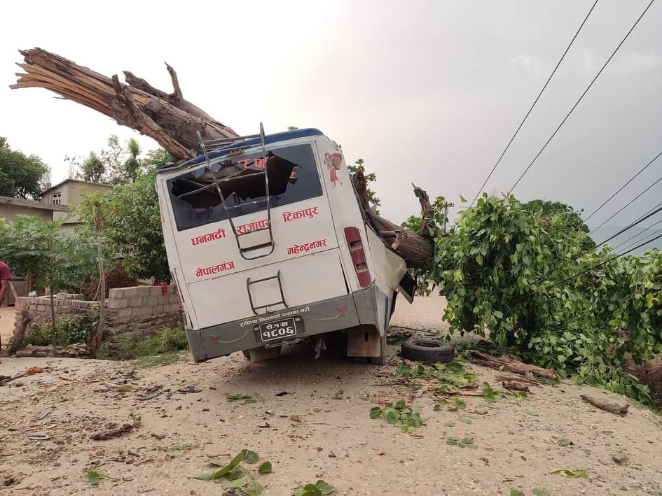 यसैगरी कैलालीको लम्किचुहा नगरपालिका ८ गोप्का स्थित भित्री सडकमा गुडीरहेको से १ ख १८०६ नम्बरको बसमाथि हावाहुरीको कारण सुकेको रुख ढल्न जाँदा बसमा सवार ८ जना घाइते भएका छन् । घाइतेहरुको स्थानीय अस्पतालमा उपचार भइरहेको छ ।