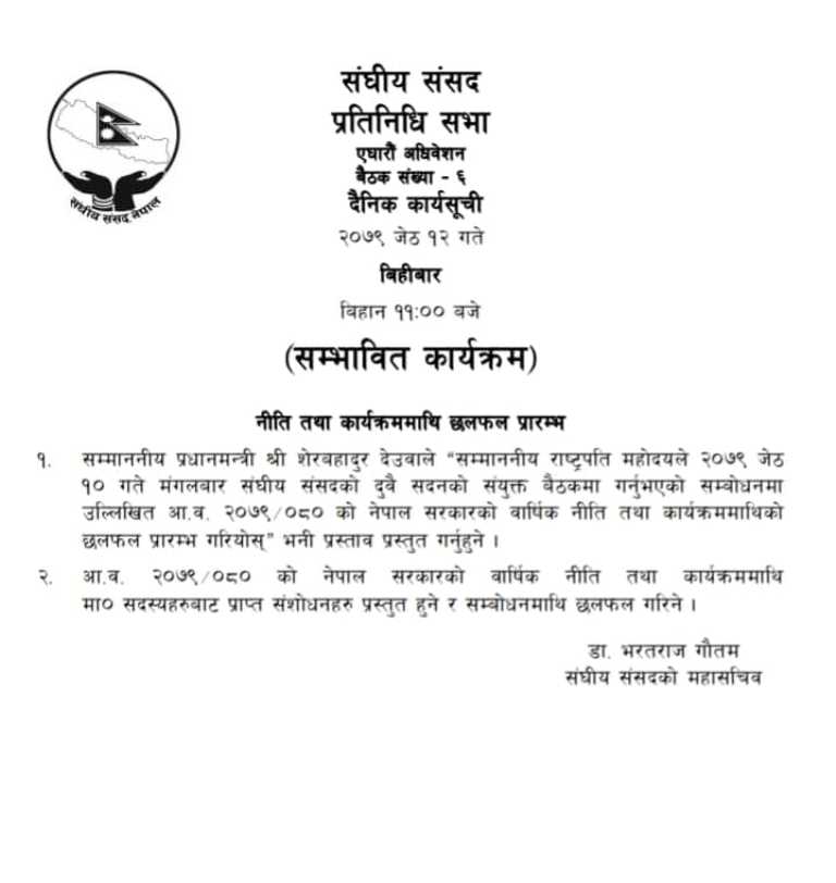 सरकारको नीति तथा कार्यक्रममाथि सांसदहरूले संशोधन प्रस्तुत् गर्ने र उक्त संशोधनमाथि छलफल सुरु हुने सचिवालयले जनाएको छ ।