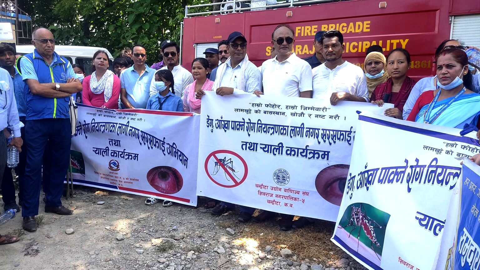 शिवराज नगरपालिका वडा नं. ५ को कार्यालय र आधारभूत स्वास्थ्य सेवा अस्पताल चन्द्रौटाको आयोजनामा कार्यक्रम गरिएको हो । डेंगु रोग नियन्त्रणका लागी लामखुट्टेको बासस्थान खौजौ र नष्ट गरौं,भन्ने नारा सहित सचेतना कार्यक्रम र सरसफाई गरिएको वडा नं. ५ का वडा अध्यक्ष नेत्र बेल्वासेले बताउनु भयो ।