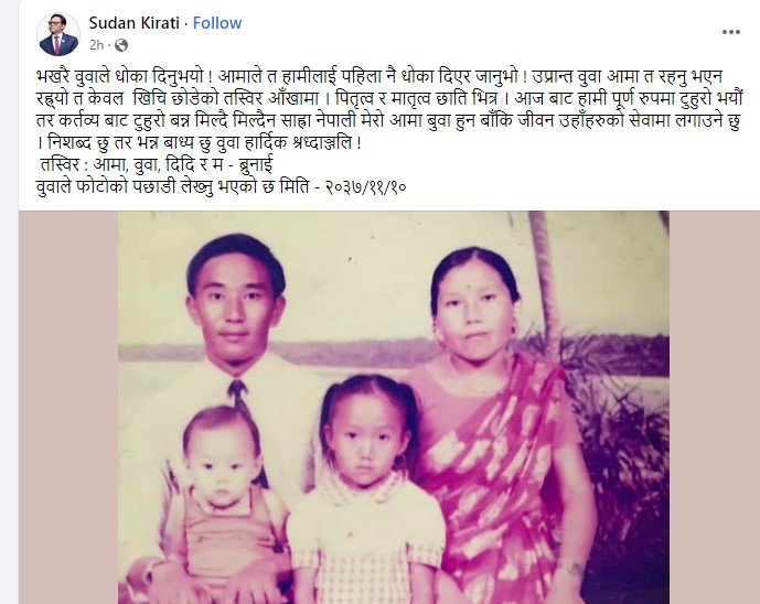 उनले फेसबुकमा लेखेका छन्, ‘भरखरै बुबाले धोका दिनुभयो ! आमाले त हामीलाई पहिला नै धोका दिएर जानुभयो ! उप्रान्त बुवा आमा त रहनु भएन रह्यो त केवल खिची छोडेको तस्बिर आँखामा । पितृत्व र मातृत्व छाती भित्र ।