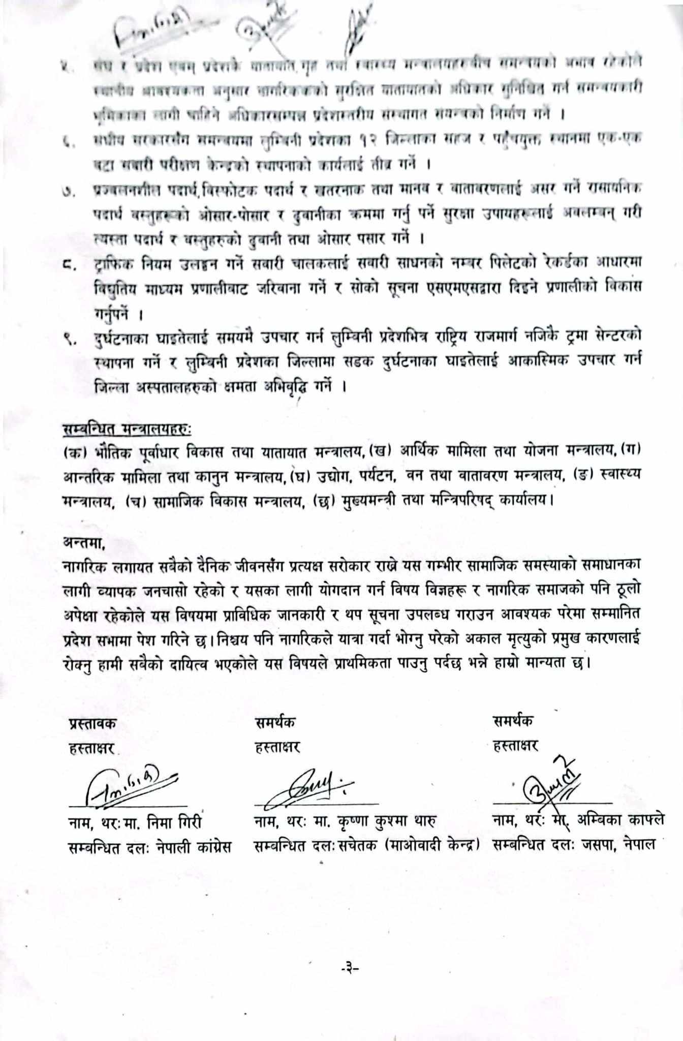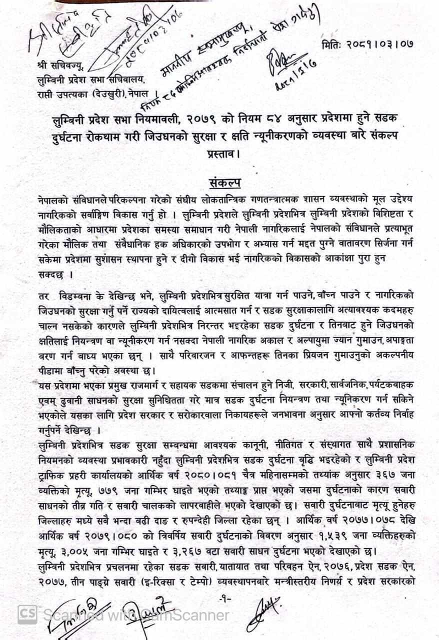 प्रदेश सभा सचिवालयमा शुक्रबार दर्ता भएको प्रस्तावमा प्रदेशमा हुने सडक दुर्घटना रोकथाम गरी जिउ धनको सुरक्षा र क्षति न्यूनिकरणको व्यवस्थाबारे उल्लेख गरिएको छ ।