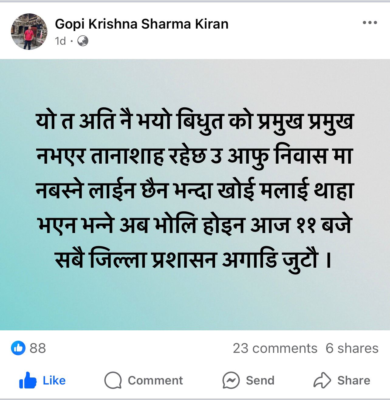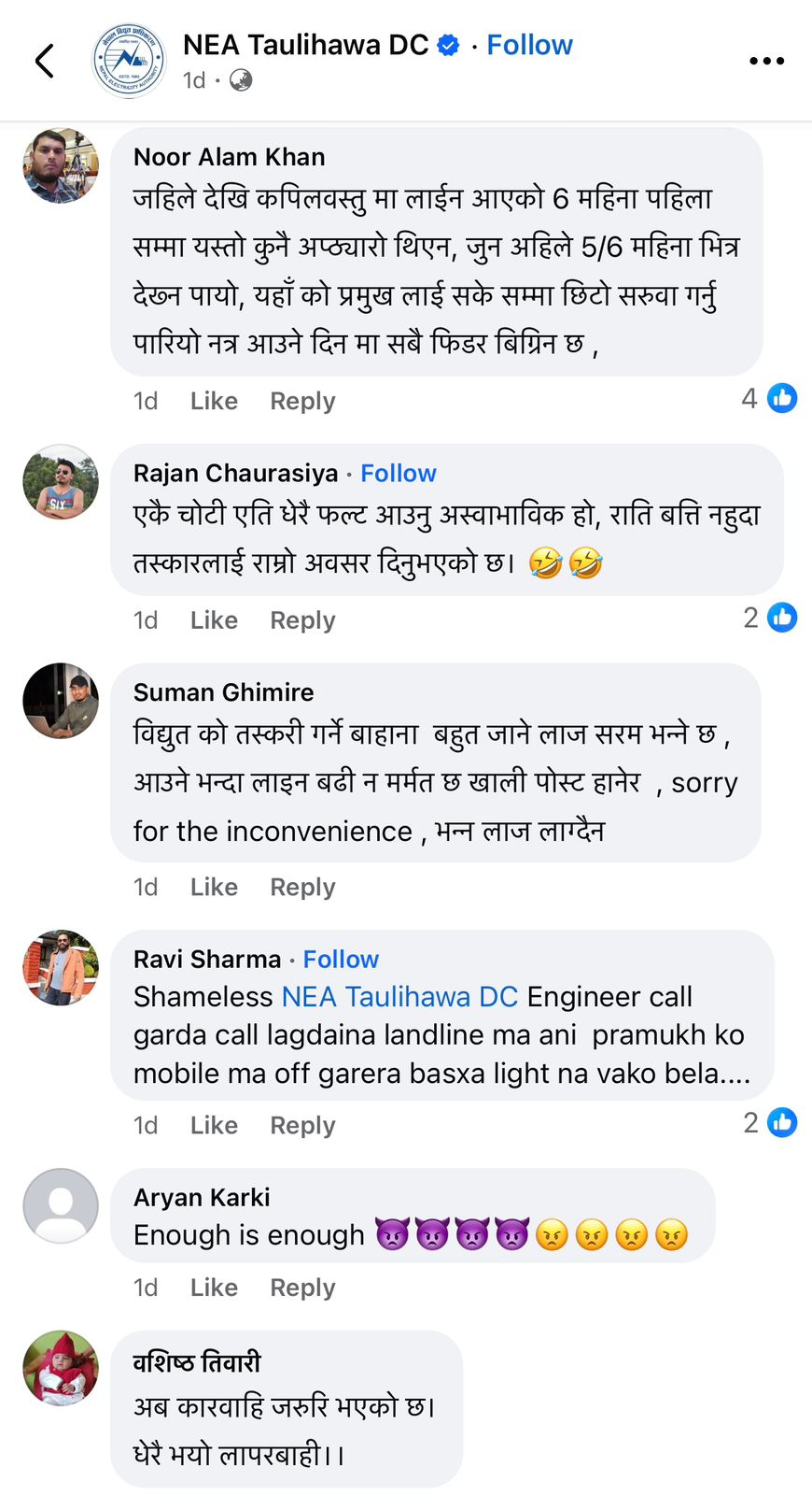 सामाजिक संजालमा समेत विद्युत प्राधिकरण विरुद्ध गाली तथा गुनासोको बाढी नै आएको छ । सहज अवस्थामा समेत पटक पटक विद्युत अवरुद्ध गरिदिने, पानी पर्नसाथ लाइन जाने र हाकिमको सेवाग्राही संग बोल्ने शैली र काम प्रतिको वेवास्ताले समेत स्थानीयबासीहरु रुष्ट बन्दै गएका छन् ।