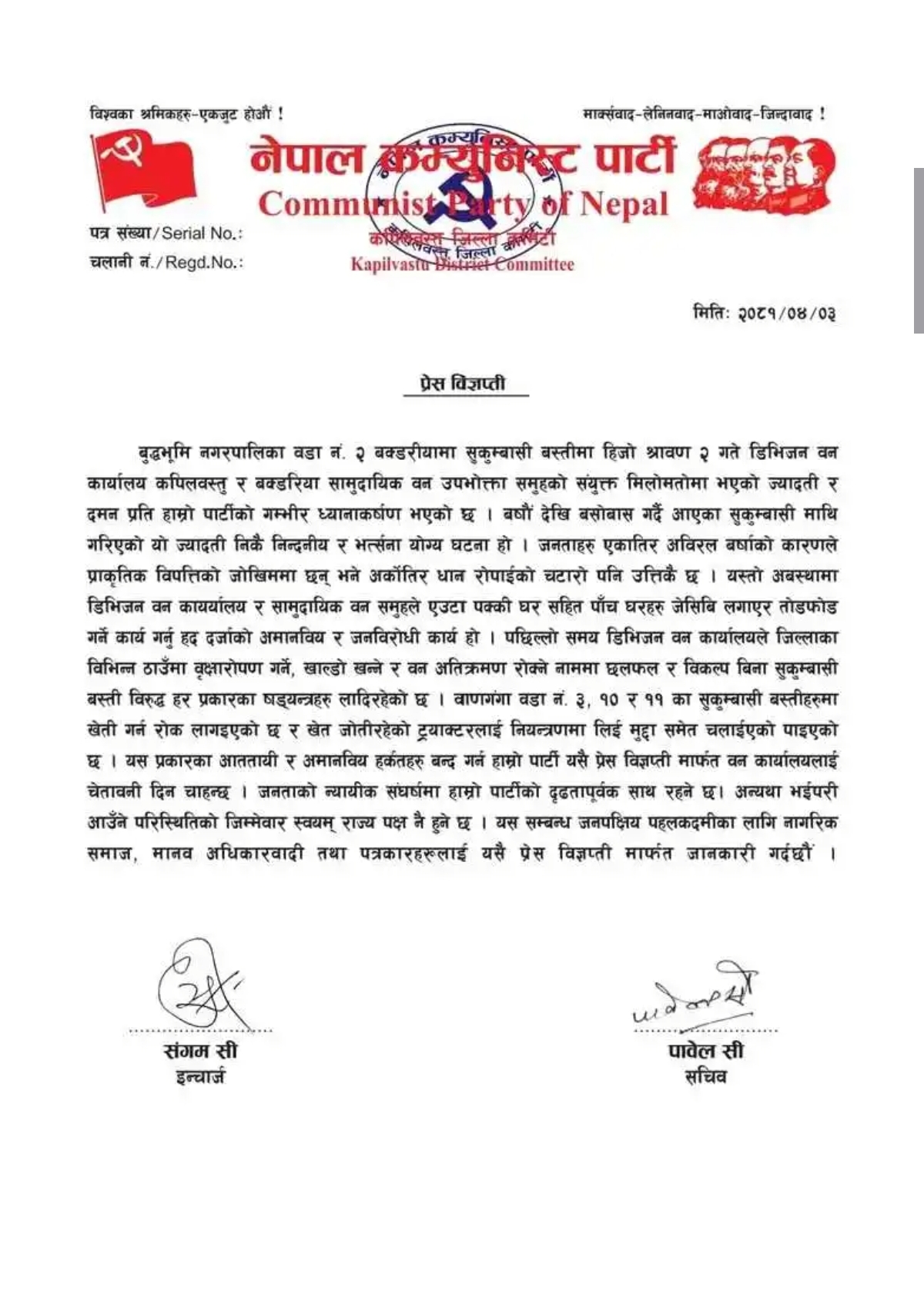 नेपाल कम्युनिस्ट पार्टी कपिलवस्तु इन्चार्ज संगम सि र जिल्ला सचिव पावेल सीको संयुक्त हस्ताक्षरबाट जारी गरिएको विज्ञप्तिमा नागरिकको घर भत्किएको भन्दै कडा निन्दा गरिएको छ ।