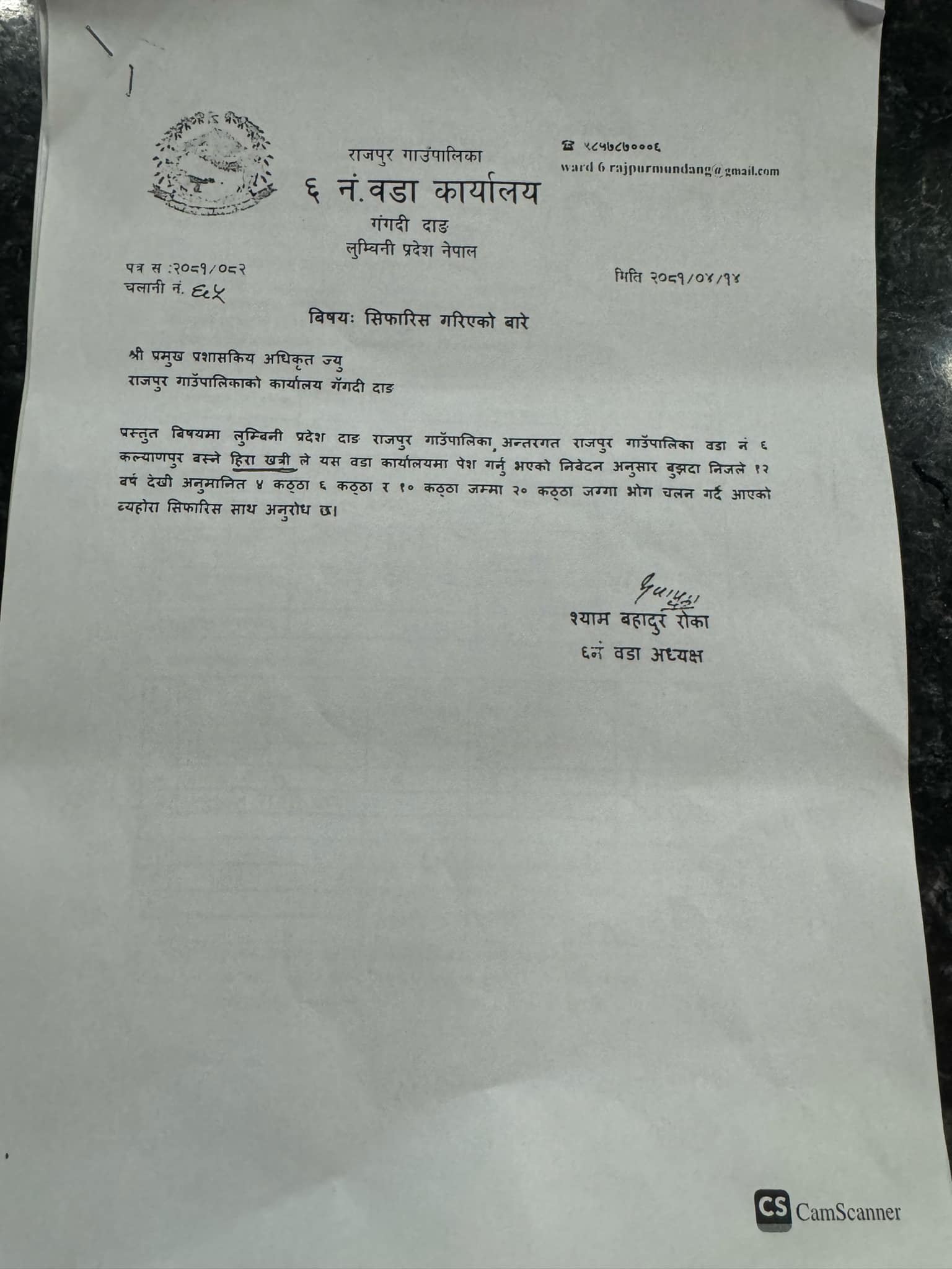 सिफारिस लिनेमा राजपुर गाउँपालिकामा कार्यरत अमिन रुकुम निवासी मनोज शाहीले आफ्नो श्रीमती प्युठान नौबहिनी गाउँपालिका–२ निवासी हिरा खत्रीको नाममा राजपुर गाउँपालिका वडा नं. ६ बाट सिफारिस लिएका छन् । २० कट्ठा जग्गा विगत १२ बर्षदेखि भोगचलन गर्दै आएको वडा कार्यालयले दिएको सिफारिसमा उल्लेख गरिएको छ ।