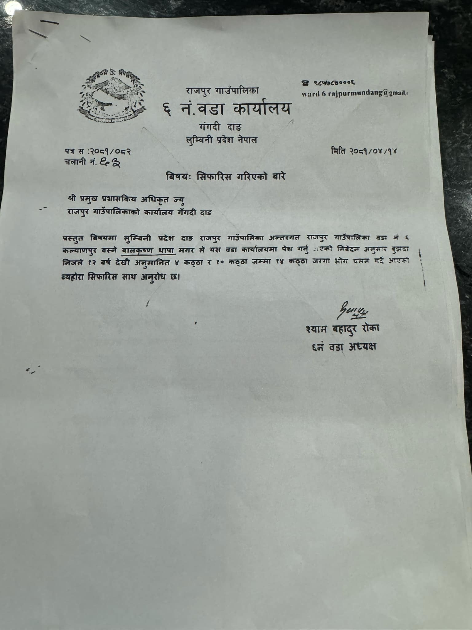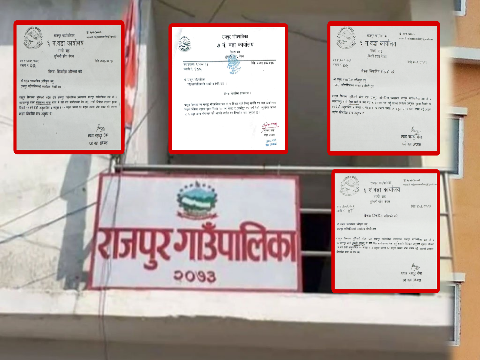 राजपुर गाउँपालिका वडा नं. ६ र ७ नम्वर वडा कार्यालबाट गैर भुमिहिन सुकुम्वासी व्यक्तिलाई जग्गा प्राप्तिका लागि सिफारिस गरेको खुलेको हो ।