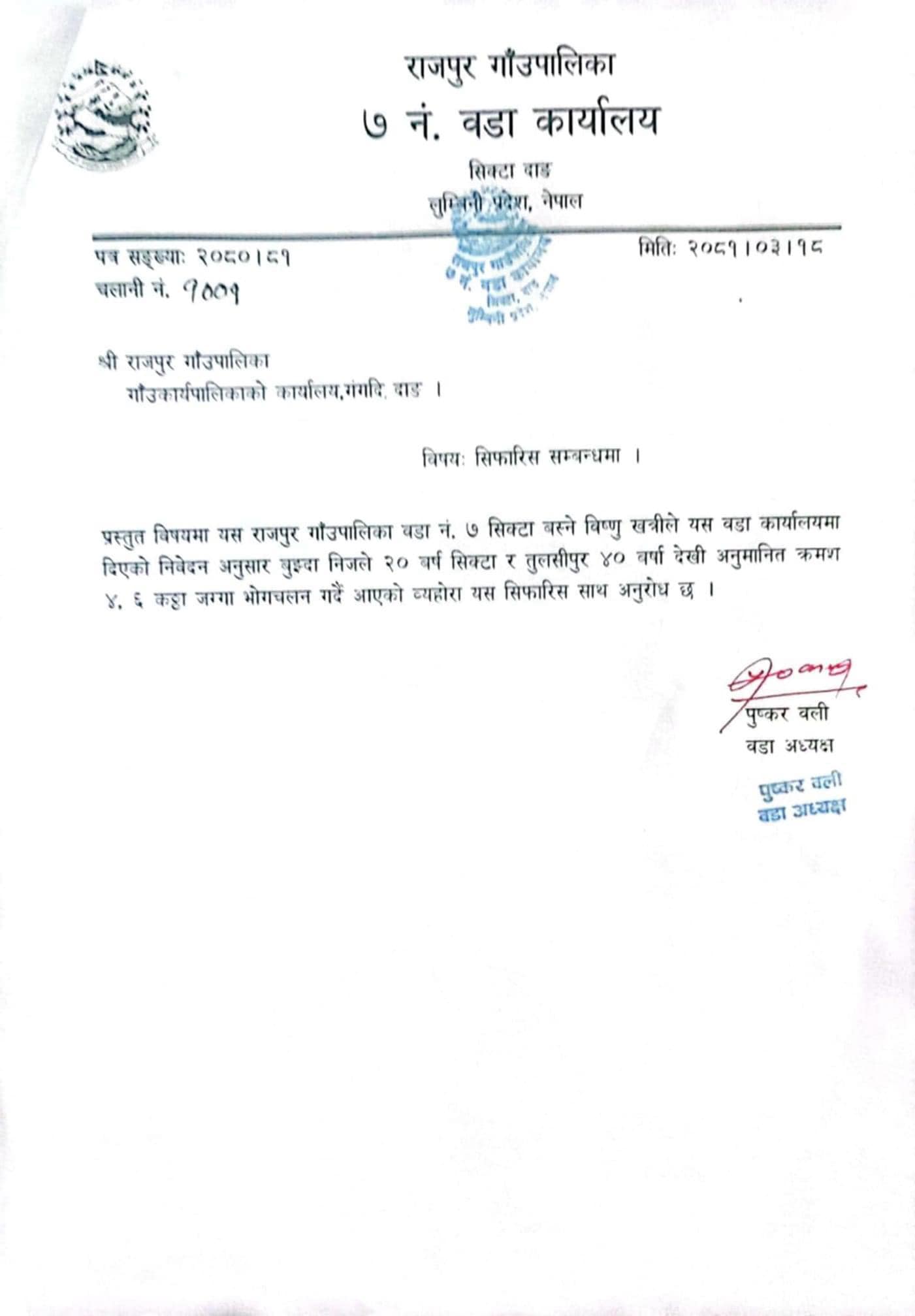 त्यसैगरी राजपुर गाउँपालिकामा प्रविधिकका रुपमा कार्यरत त्रिवेणी गाउँपालिका–४ रुकुम पश्चिम निवासी पत्रबहादुर वलीले आफ्नो श्रीमती लक्ष्मी खड्काको नाममा १८ कट्ठा जग्गाको सिफारिस लिएका छन् । उनले प्राप्त गरेको सिफारिसमा वडा कार्यालयले विगत १२ बर्षदेखि जग्गा भोगचलन गर्दै आइरहेको उल्लेख गरिएको छ ।
