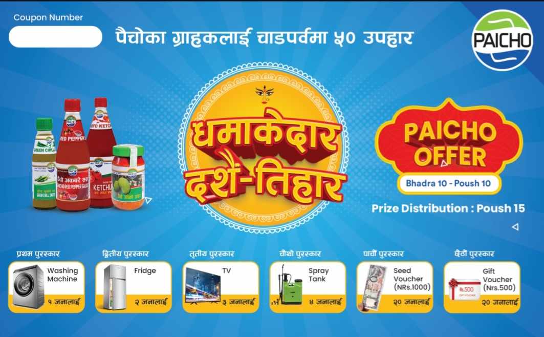 काठमाडौं । पैचो पसल प्रालिले चाडपर्व अवसरमा उपहार योजना सार्वजनिक गरेको छ ।