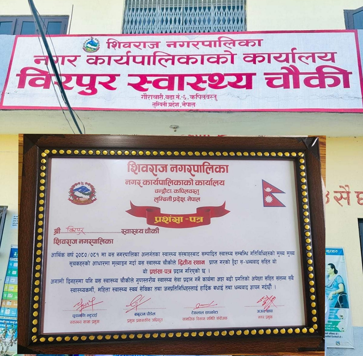 यस उपलब्धिलाई सम्मान गर्दै, शिवराज नगरपालिकाले बिरपुर स्वास्थ्य चौकीलाई प्रशंसा पत्रले सम्मानित गरेको वडाअध्यक्ष माहेताब आलम खाले जानकारी दिनुभयो ।