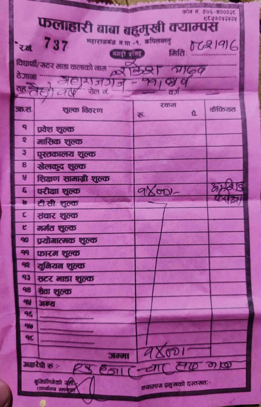 कपिलबस्तु जिल्लाको महाराजगंज नगरपालिका वडा न १ मा सञ्चालित फलाहारी बाबा बहुमुखी क्याम्पसमा नियम बिपरीत शुल्क लिएको पाईएको हो । त्रिभुवन विश्वविद्यालय ले जारी गरेको तेस्रो बर्षे परीक्षा फारम शुल्क नियम विपरित भएपछि बिद्याथीहरुले बिरोध जनाएका हुन् ।