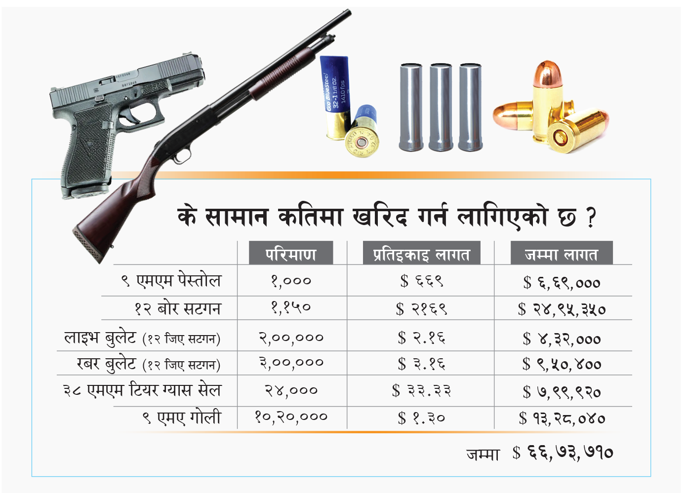 गृह मन्त्रालयका प्रवक्ता रामचन्द्र तिवारीले प्रहरीलाई हतियार तथा भिड नियन्त्रणका सामान खरिदमा केही बजेट परेको, तर कति बजेट भन्ने विषयमा आफूलाई जानकारी नभएको बताए । ‘प्रहरीमा लामो समयदेखि भिड नियन्त्रणका सामग्री अभाव रहेको, केही सामानमा म्याद सकिएको विषय उठ्दै आएको थियो, त्यसकारण यसपटक त्यसका लागि केही बजेट परेको छ,’ उनले भने, ‘तर, खरिद प्रक्रियाबारे विस्तृत जानकारी छैन ।’