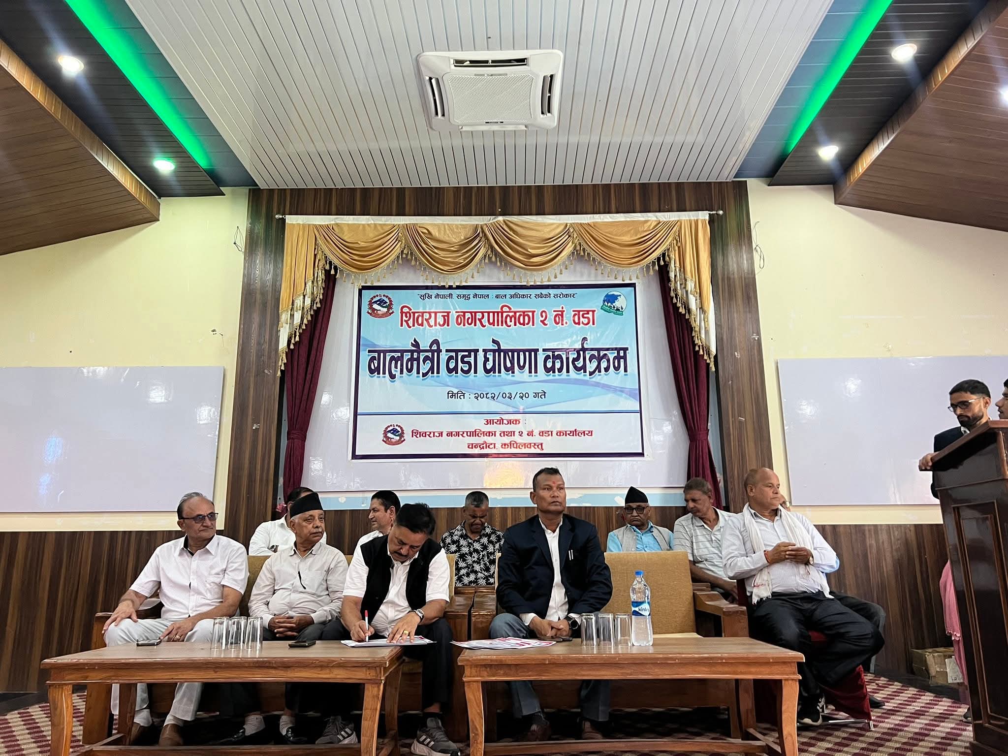 कपिलवस्तुको शिवराज नगरपालिका वडा नम्बर २ ले वडालाई बालमैत्री वडा घोषणा गरेको छ। बाल अधिकार र बालमैत्री वातावरण सुदृढ बनाउने उद्देश्यले शुक्रवार एक भव्य कार्यक्रमको आयोजना गरि वडालाई बालमैत्री वडा घोषणा गरेको हो ।