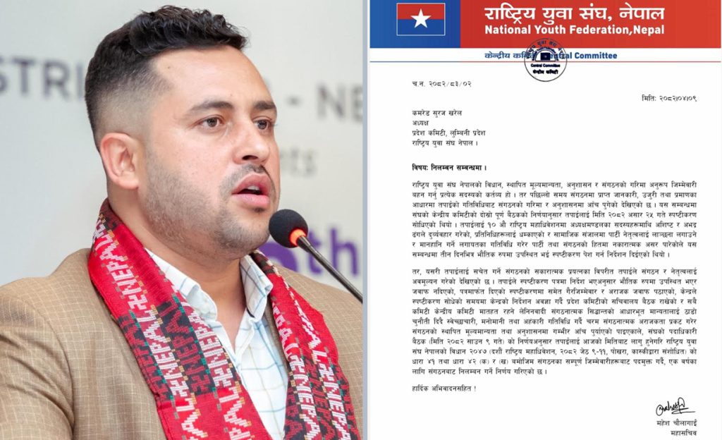 पूर्व राष्ट्रपति विद्यादेवी भण्डारीको पक्षमा खुलेका राष्ट्रिय युवा संघ नेपालका लुम्बिनी प्रदेश अध्यक्ष सुरज खरेल निलम्बनमा परेका छन् ।संघले खरेललाई एक वर्षका लागि निलम्बन गरेको हो । साउन ९ गते बसेको पदाधिकारी बैठकले खरेललाई निलम्बन गर्ने निर्णय गरेको जनाएको छ ।रुपन्देहीको देवदहका खरेललाई राष्ट्रिय युवा संघ नेपालको विधान २०४७ ९दशौं राष्ट्रिय महाधिवेशन, २०८२ जेठ ९(११, पोखरा, कास्कीद्वारा संशोधितको धारा ४१ तथा धारा ४२ ९क० र ९ख० बमोजिम संगठनका सम्पूर्ण जिम्मेवारीहरूवाट पदमुक्त गर्दै, एक वर्षका लागि संगठनबाट निलम्बन गर्ने निर्णय गरिएको महासचिव रमेश चौलागाईले जारी गरेको पत्रमा उल्लेख छ ।