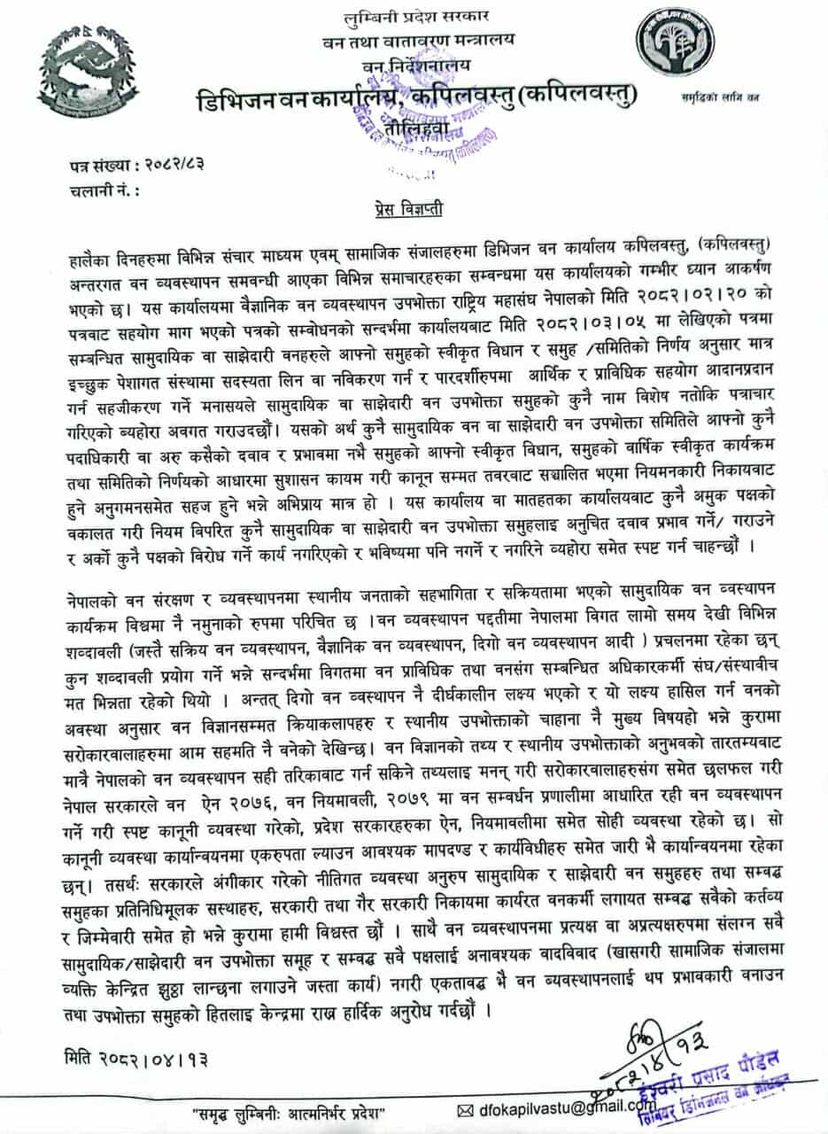 डिभिजन वन कार्यालय, कपिलवस्तुले हालसालै सामाजिक सञ्जाल र केही सञ्चारमाध्यमहरूमा फैलाइएको भ्रमपूर्ण सूचनाप्रति गम्भीर आपत्ति जनाउँदै स्पष्टीकरण सहित प्रेस विज्ञप्ति सार्वजनिक गरेको छ। सामुदायिक वन उपभोक्ता महासङ्घ (फेकोफन) सम्बन्धित स्थानीय प्रतिनिधिबाट सार्वजनिक रूपमा वैज्ञानिक वन व्यवस्थापनसम्बन्धी तथ्यहीन टिप्पणी र आरोपहरू लगाइएपछि कार्यालयले वन ऐन, नियमावली र कार्यविधिअनुसार काम भइरहेको जानकारी दिएको हो।