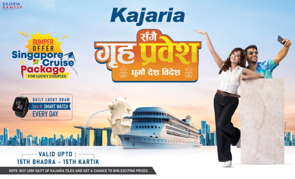 यस योजनामा सहभागी हुन ग्राहकहरूले आधिकारिक डिलरबाट कम्तीमा १,००० वर्गफिट काजारिया टायल्स खरिद गर्नुपर्नेछ। १,००० वर्गफिट भन्दा बढी खरिद गर्ने ग्राहकहरूले दैनिक लक्की ड्रमार्फत स्मार्टवाच जित्न योग्य हुनेछन् भने केही भाग्यमानी जोडीहरूले सम्पूर्ण खर्चसहितको सिंगापुर क्रुज भ्रमण अवसर पाउनेछन्। योजना भदौ १५ देखि कात्तिक १५ सम्म लागू हुनेछ।