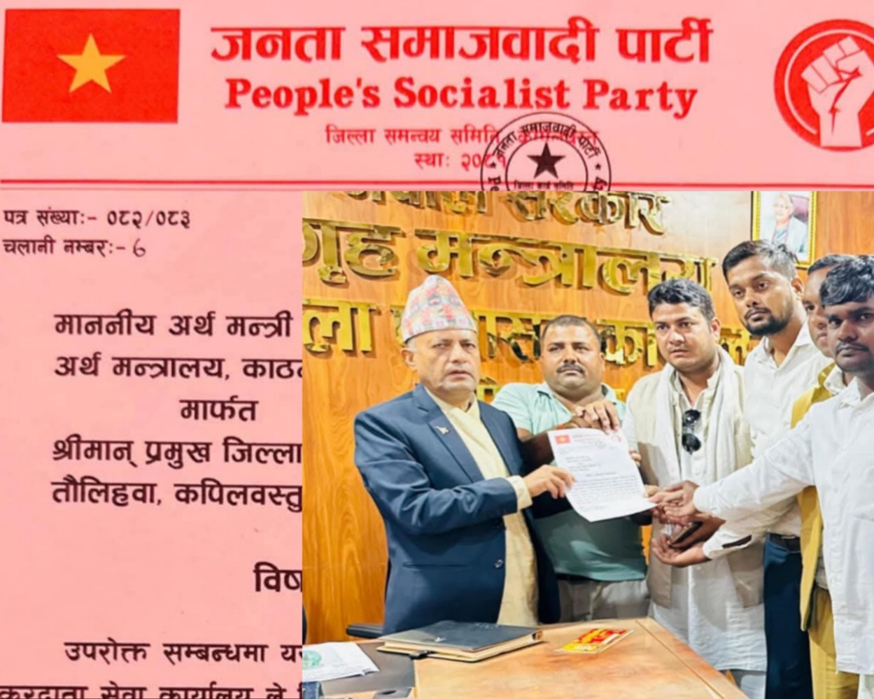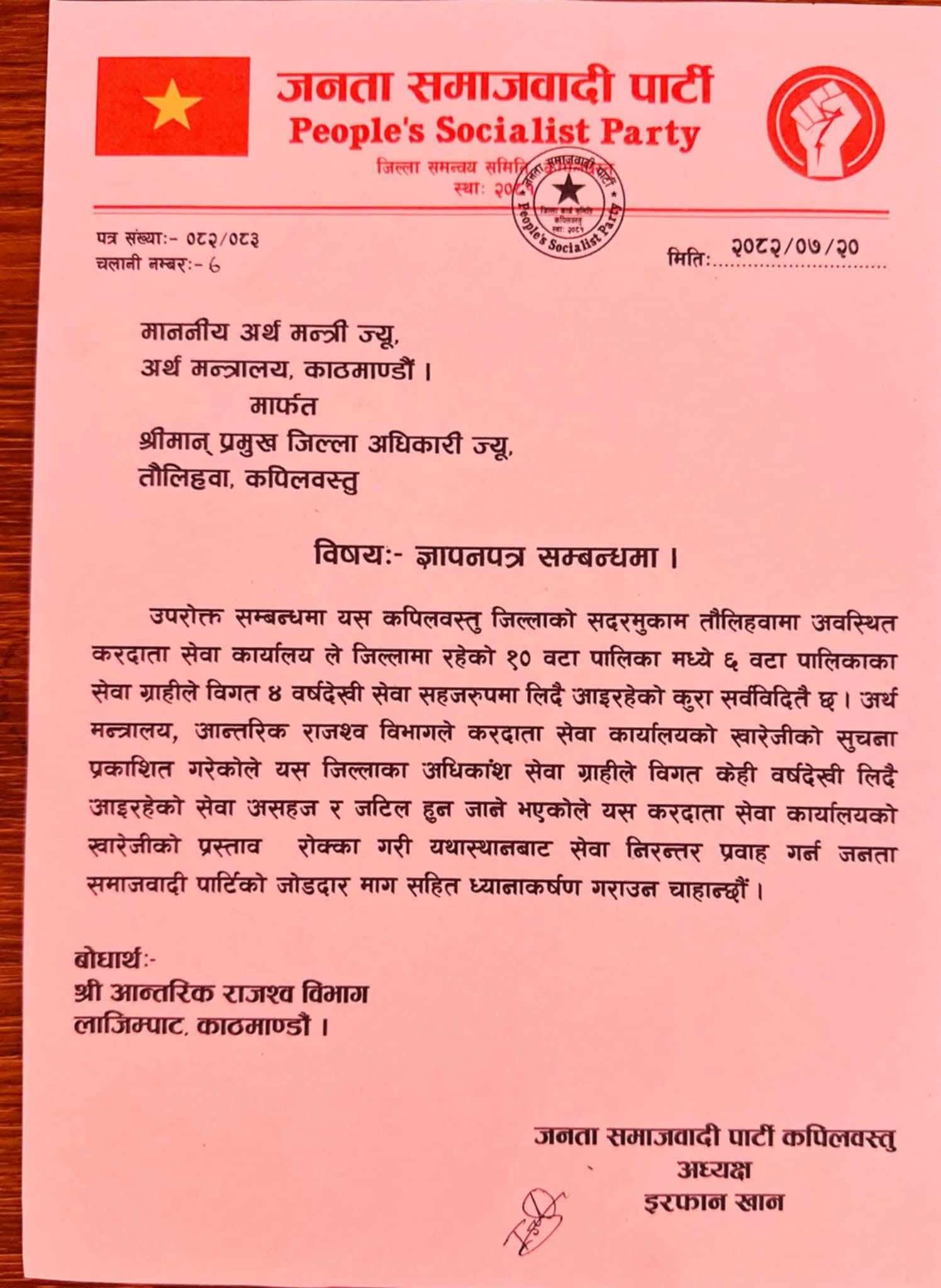 अर्थ मन्त्रालयले देशभरका २३ वटा करदाता सेवा कार्यालय खारेज गर्ने निर्णय गरेपछि सो निर्णयको विरोधमा जनता समाजवादी पार्टी (जसपा) कपिलवस्तुले ज्ञापनपत्र बुझाएको छ। जसपा कपिलवस्तुका अध्यक्ष इरफान खानको नेतृत्वम ज्ञापन पत्र बुझाइएको हो ।