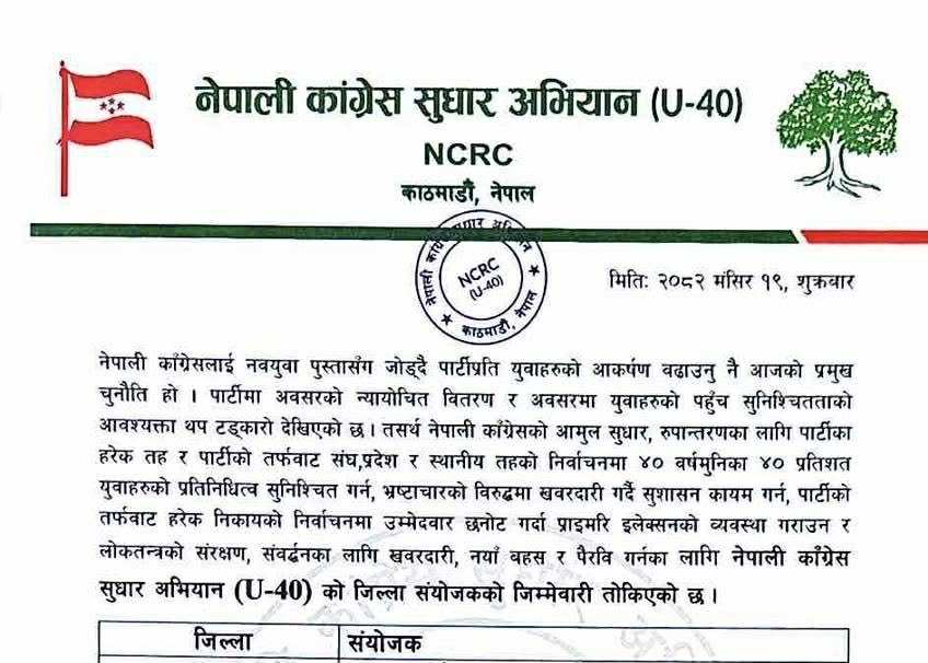 नेपाली कांग्रेस (NC) लाई नयाँ पुस्तासँग जोड्ने र पार्टीमा युवा सहभागिता सुनिश्चित गर्ने उद्देश्यका साथ सञ्चालित नेपाली कांग्रेस सुधार अभियान (U-40) को कपिलवस्तु जिल्ला संयोजकमा युवा नेता कृष्ण गिरी चयन हुनुभएको छ ।