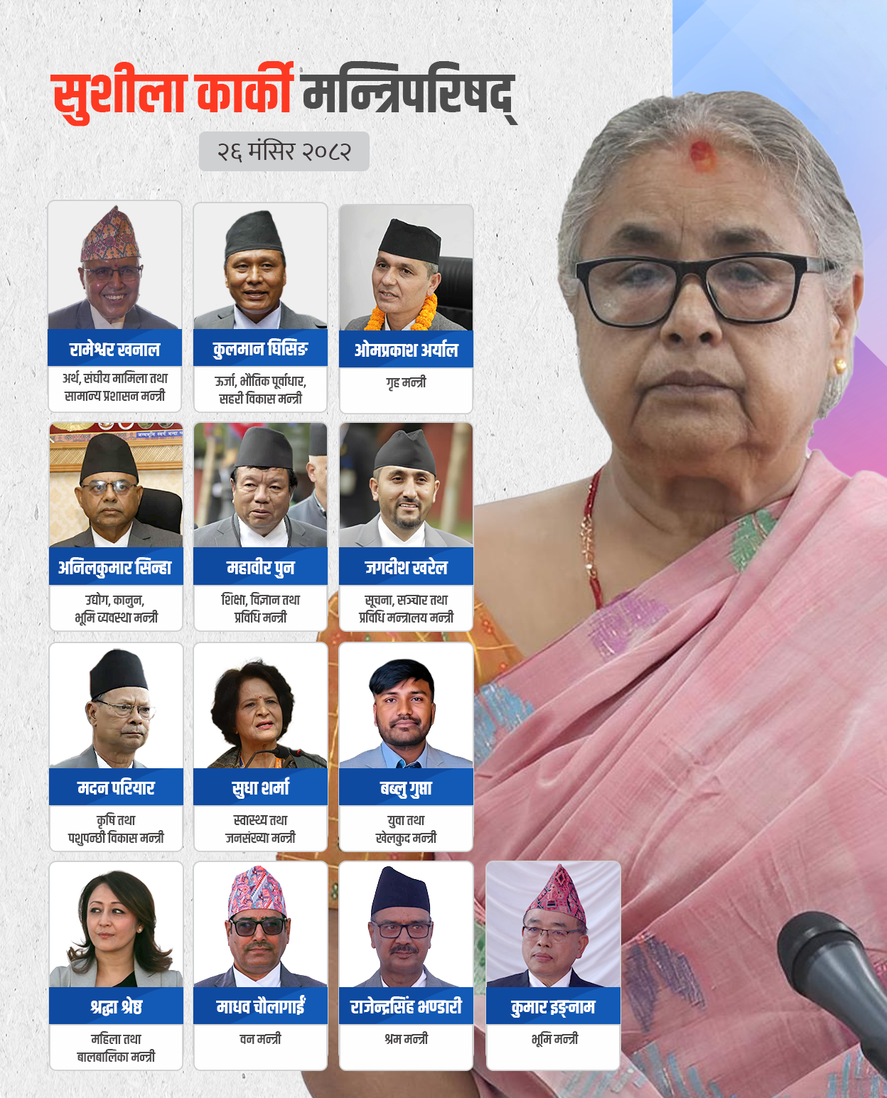शुक्रबार थपिएका मन्त्रीहरूमा श्रद्धा श्रेष्ठ, माधव चौलागाईं, राजेन्द्रसिंह भण्डारी र कुमार इङ्नाम छन् । श्रद्धालाई महिला तथा बालबालिका, चौलागाईं वन, भण्डारीलाई श्रम र इङ्नाम भूमि मन्त्रालयको जिम्मेवारी पाएका छन् । नवनियुक्त मन्त्रीहरूले राष्ट्रपति रामचन्द्र पौडेलबाट आज अपरान्ह शपथ लिएका छन् । ९ कात्तिकमा तेस्रोपटक पनुर्गठन हुँदा १० सदस्यीय रहेको मन्त्रिपरिषद्लाई चौथोपटक विस्तार गरेर १४ सदस्यीय बनाइएको छ ।