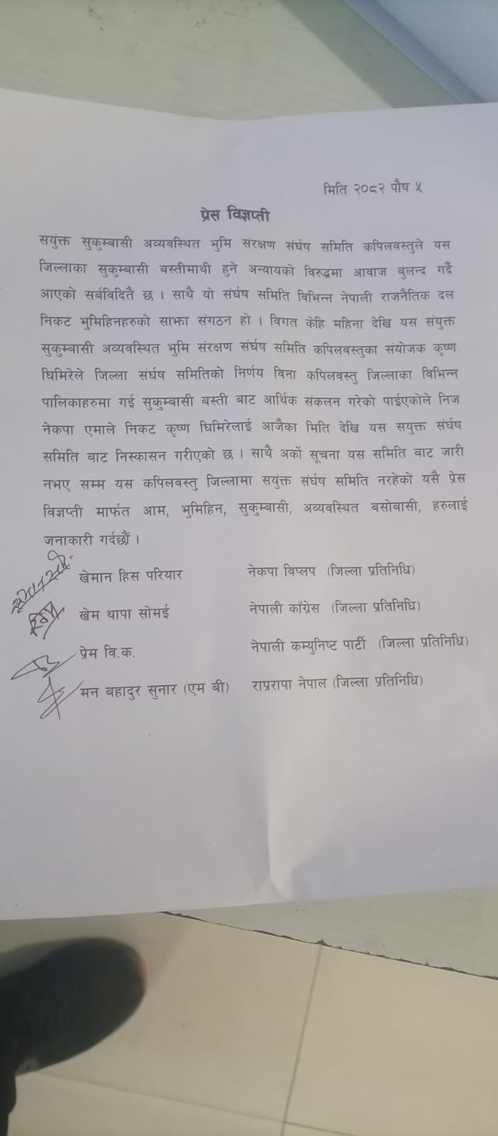 संयुक्त सुकुम्बासी अव्यवस्थित भूमि संरक्षण संघर्ष समिति कपिलवस्तुले आफ्ना संयोजक कृष्ण घिमिरेलाई समितिबाट निस्कासन गरेको छ ।