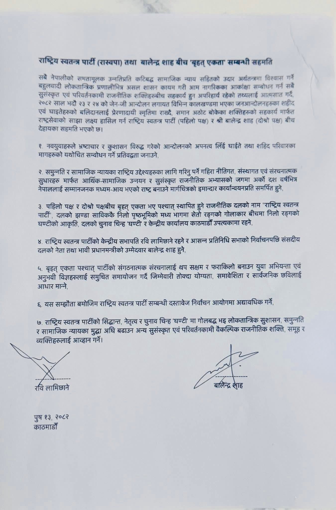 सम्झौतापत्रमा लामिछाने र शाह दुवैले आ–आफ्नो पदीय हैसियतमा मौन रहेर नाममात्रै लेखेका छन् । सम्झौतामा राष्ट्रिय स्वतन्त्र पार्टीको विषयवस्तु उल्लेख भए पनि रवि लामिछानेको नाममात्रै छ, पद लेखिएको छैन ।
