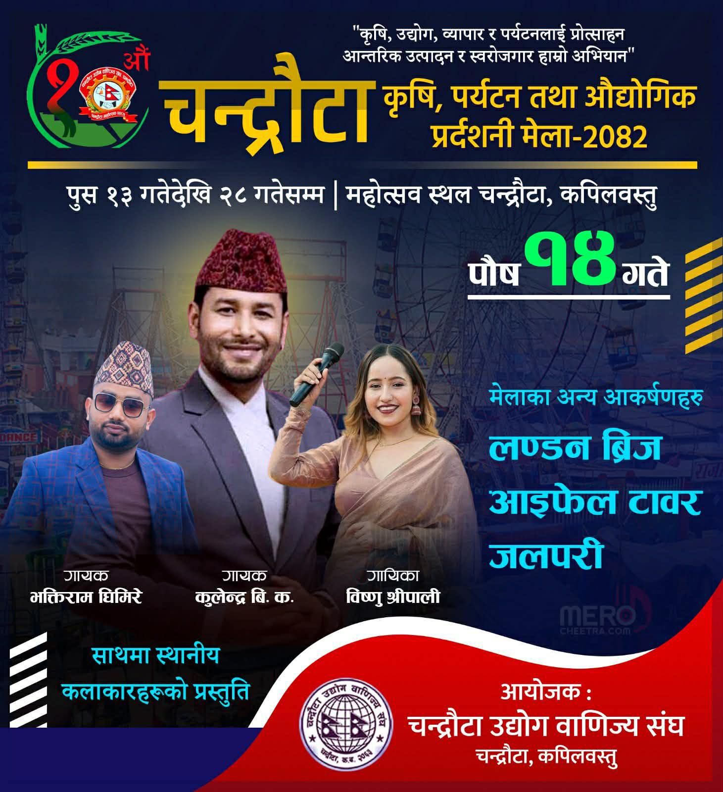 “कृषि, उद्योग, व्यापार र पर्यटनलाई प्रोत्साहन, आन्तरिक उत्पादन र स्वरोजगार हाम्रो अभियान” भन्ने मूल नारासहित दशौँ चन्द्रौटा कृषि, पर्यटन तथा औद्योगिक महोत्सव–२०८२ सुरु भएको छ ।