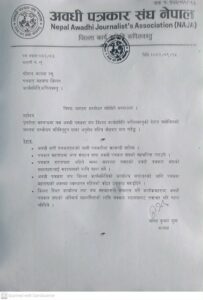 यसैगरी जिल्लास्थित कार्यालय तथा संघसंस्थाले सञ्चालन गर्ने कार्यक्रममा अवधी पत्रकार संघको अनिवार्य सहभागिता सुनिश्चित गर्न पत्रकार महासंघले सम्बन्धित निकायसँग समन्वय गरी पहल गरिदिन माग गरेको अवधी पत्रकार संघका सचिव बृजेश यादवले बताए ।