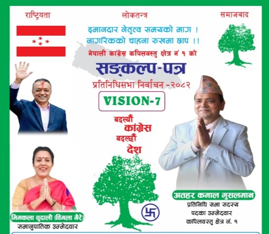 नेपाली काँग्रेस कपिलवस्तु क्षेत्र नं. १ ले प्रतिनिधीसभा निर्वाचनका लागी सो क्षेत्रको सङकल्प पत्र (भिजन सेवेन) सार्वजनिक गरेको छ ।